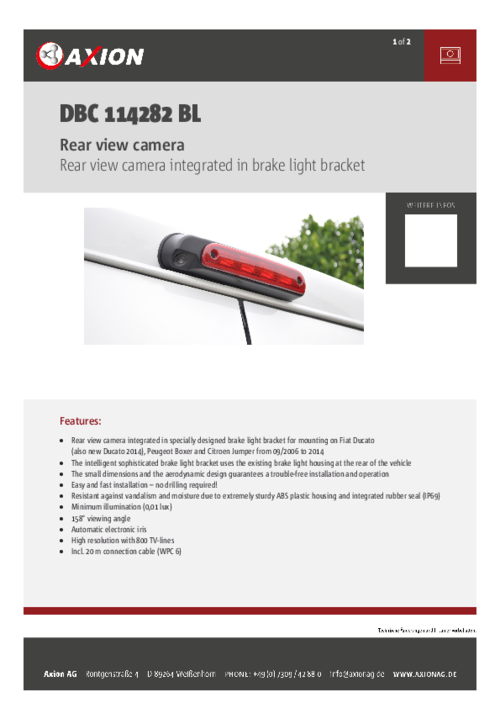 - Reversing camera integrated in specially developed brake light console for mounting on Fiat Ducato (also new Ducato 2014), Peugeot Boxer and Citroen Jumper