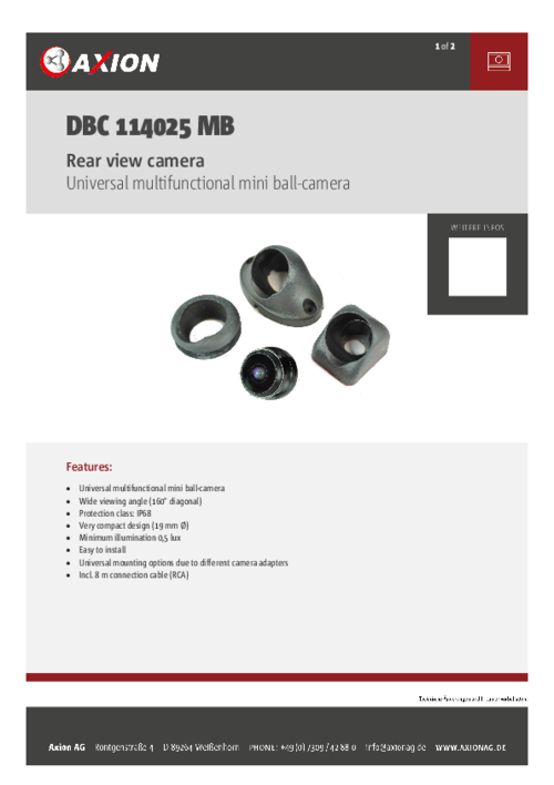 Image sensor 1/4 " CCDS sensor resolution 921,000 pixels Viewing angle 160° (H: 130°/V:80°) Focal length Light sensitivity 0.5 lux Video system NTSC Image mirroring yes Connection RCA Protection class IP 68 Operating temperature -30 °C to + 70 °C Vibration resistance Shock resistance Power supply 12 V Power consumption max. 40 mA Dimensions (W x H x D) 19 mm weight 20 g Test marks, certificates ECE-R10 -