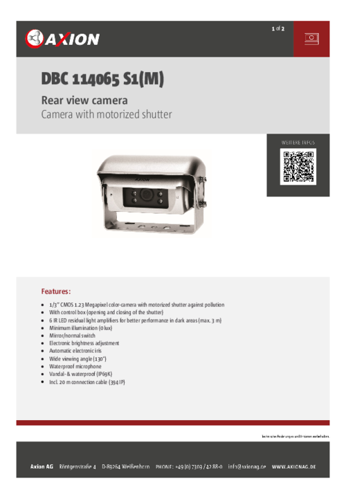 Image sensor 1.23 Megapixel High Resolution CMOS Senosor IR-LED projector 6 Light sensitivity 0 lux Resolution >700 TV lines Viewing angle 130° Protection class IP 69K Power supply 12 V Power consumption max. 3 W Vibration resistant up to 10 G Shock resistance 100G Signal/noise ratio 46 dB Operating temperature -40 °C to +85 °C Dimensions (W x H x D) 110x85x75 mm Weight approx. 390 g -