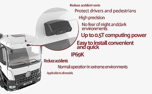 The camera-based system uses artificial intelligence to process the image information in real time and informs or warns the driver if there are people in the defined area. The driver receives information and warning signals via the LED display in the cab to focus their attention on what is happening and avoid impending collisions.