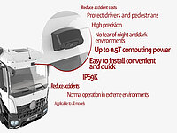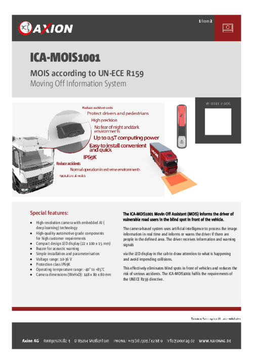 This effectively eliminates blind spots in front of vehicles and reduces the risk of serious accidents. The ICA-MOIS1001 fulfils the requirements of the UNECE R159 directive.Special features:
