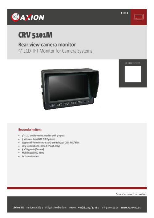 Screen diagonal 5 inch ( 12,7cm) resolution 800 * 3 (RGB) * 480 Screen brightness 500 cd/m2 Viewing angle r/l :85° , o/u: 85° Image reflection Yes Picture standard AHD, PAL / NTSC (automatic) Day/night switching Yes, sensor Loudspeaker Yes Camera input 3x AXION 4p Mini-DIN Control lines (trigger) 3 Power supply 12/24 V Operating temperature -20 °C to + 70 °C Storage temperature -30 °C to + 85 °C Guide lines Yes (can be switched on) OSD (operating menu) Multilingual Power-on mode Yes Housing protection class - Dimensions (LxWxH) 145x99x26 mm weight approx. 400 g Test marks, certificates ECE-R10, CE, ROHS -