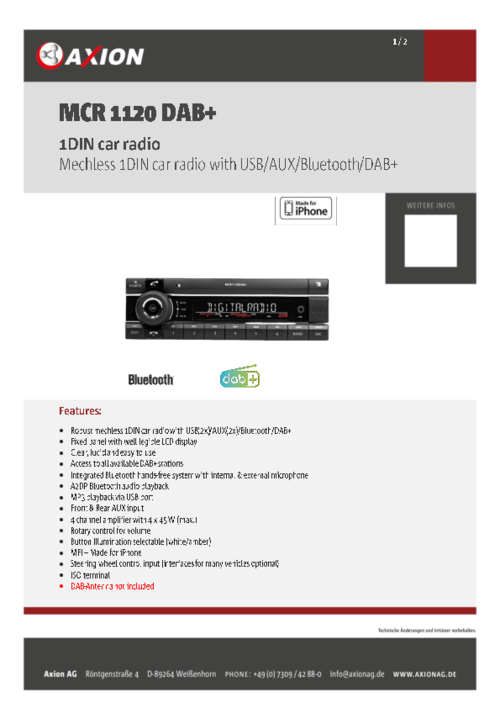 - Robust drive-less 1DIN car radio with USB(2x)/AUX/Bluetooth/DAB+