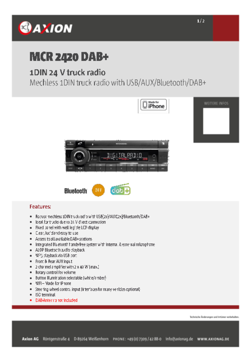 - Robust, drive-free 1DIN truck radio with USB(2x)/AUX(2x)/Bluetooth/DAB+