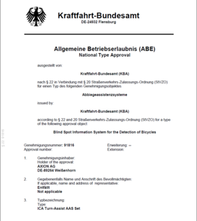 Am 04.06.2019 hat das Kraftfahrtbundesamt (KBA) die allgemeine Betriebserlaubnis (ABE) für 2 Varianten unseres ICA-Turn Assist AAS Set erteilt.