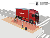 Die neue Generation des ICA Turn-Assist verwendet modernste Technologie. Mithilfe von künstlicher Intelligenz wird das Kamerabild laufend ausgewertet. Sobald sich ein VRU im Abdeckungsbereich befindet, wird der Fahrer darauf hingewiesen. Bei Kollisionsgefahr wird zusätzlich eine Warnung ausgegeben. Das mehrstufige Warnkonzept hilft dem Fahrer stets dabei, die Situation besser einzuschätzen und Unfälle zu vermeiden.