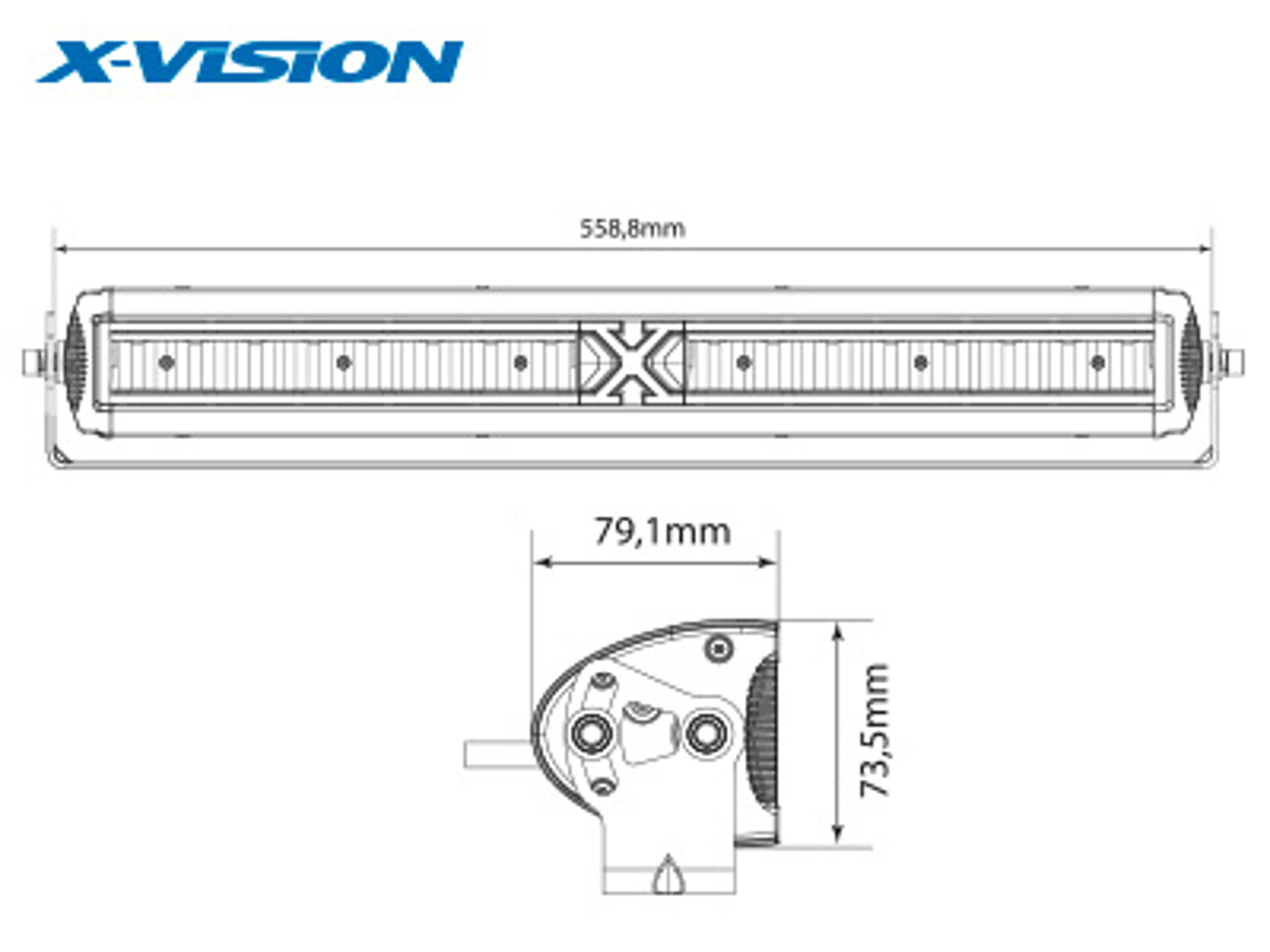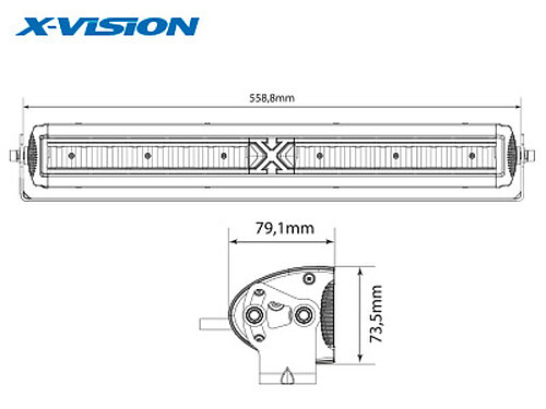 Verbrauch 128W, 16x8W Osram LED Dioden Lichtfarbe 6.250 Kelvin Lumen 9.000 X-beleuchtetes Standlicht 15,2 W Ref 37.5 Ausleuchtungstyp Spot Schutzklasse IP67 Betriebstemperatur -40° bis +85°C Spannung 9-32V DC Abmessungen 558,8 x 73,5 x 79,1 mm