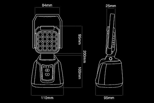 Leistungsstarke wiederaufladbare 16W C-BRIGHT LED-Arbeitsleuchte mit Griff. Mit starken Magneten an der Unterseite versehen. Die Lampe kann 4 Stunden lang mit voller Stärke leuchten und verfügt über eine Batteriestatusanzeige.