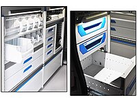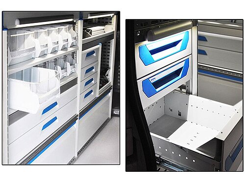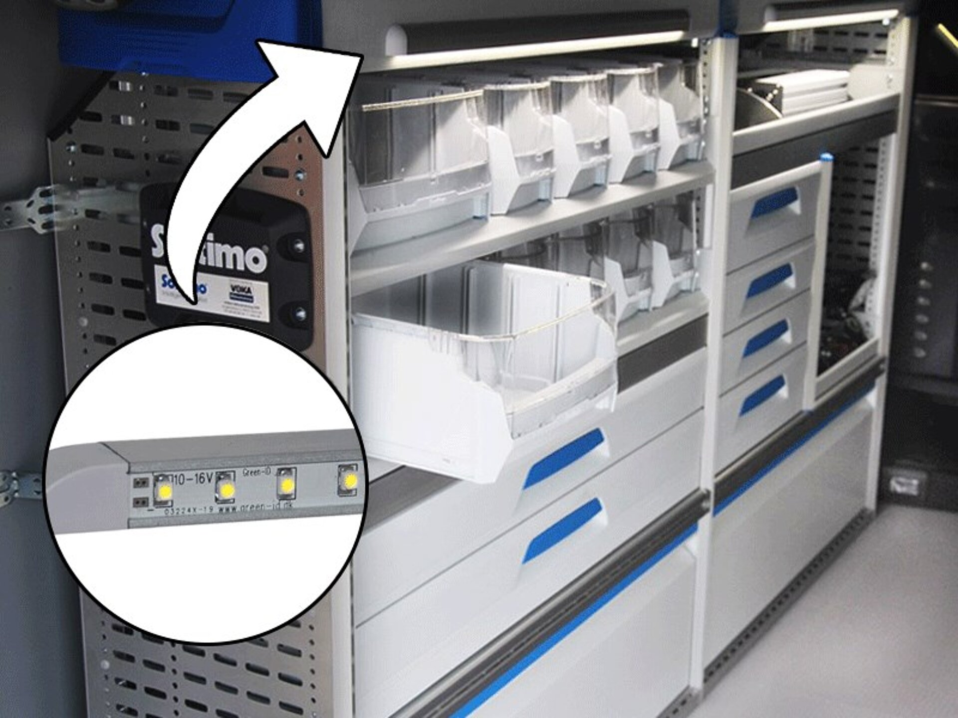 Die Green:ID Shelf-Rails wurden speziell für Regalesysteme und Schubladen entwickelt, die sich in kleinen Arbeitsräumen wie z.B Transportern befinden. Trotz einer geringen Tiefe von 1,2 cm liefern die Shelf Rails eine perfekte Ausleuchtung bis in die unterste Schublade.