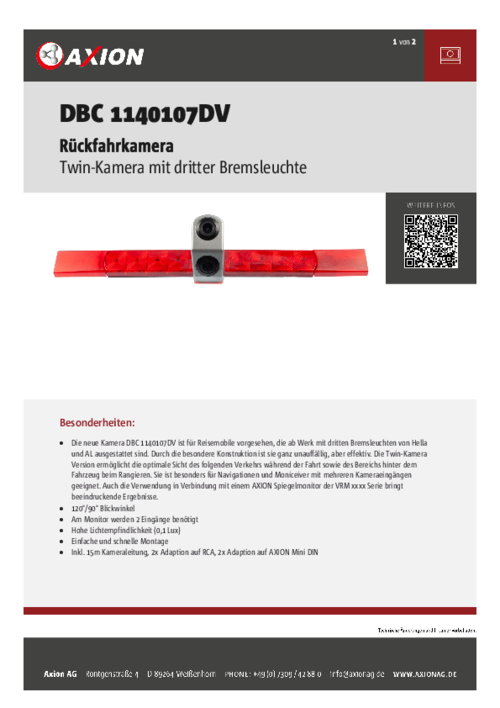 - Die neue Kamera DBC1140107DV ist für Reisemobile vorgesehen, die ab Werk mit dritten Bremsleuchten von Hella und AL ausgestattet sind. Durch die besondere Konstruktion ist sie ganz unauffällig, aber effektiv. Die Twin-Kamera Version ermöglicht die optimale Sicht des folgenden Verkehrs während der Fahrt sowie des Bereichs hinter dem Fahrzeug beim Rangieren. Sie ist besonders für Navis und Moniceiver mit mehreren Kameraeingängen geeignet. Auch die Verwendung in Verbindung mit einem AXION Spiegelmonitor der VRM xxxx Serie bringt beeindruckende Ergebnisse.