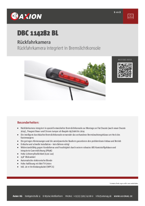 - Rückfahrkamera integriert in speziell entwickelter Bremslichtkonsole zur Montage an Fiat Ducato (auch neuer Ducato 2014), Peugeot Boxer und Citroen Jumper