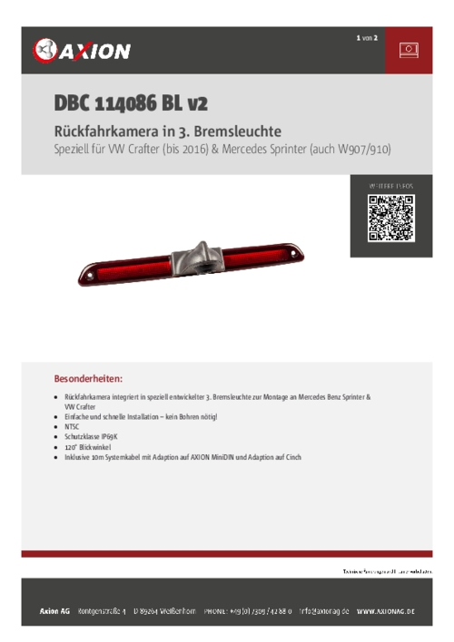 - Rückfahrkamera integriert in speziell entwickelter 3. Bremsleuchte zur Montage an Mercedes Benz Sprinter & VW Crafter