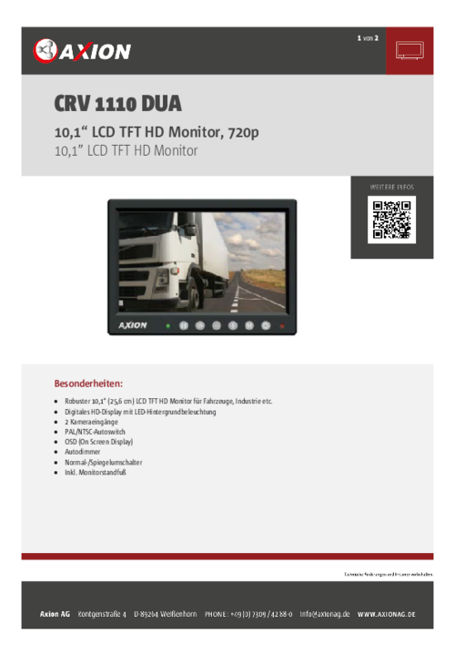 Bildschirmdiagonale 10,1 Zoll Auflösung 1024x600 Bildhelligkeit 450 cd/m2 Bildspiegelung Ja Bildnorm PAL / NTSC Tag-/Nachtumschaltung Ja, Sensor Lautsprecher Ja Kamera-Eingang 2x AXION Mini-Din, AHD 720p & CVBS Spannungsversorgung 10-30 V Stromverbrauch <7W Betriebstemperatur -20 °C bis +70 °C OSD (Bedienmenü) 7 Sprachen Abmessungen (LxBxH) 255x183x42 mm Gewicht 720 g Prüfzeichen, Zertifikate ECE-R10, CE