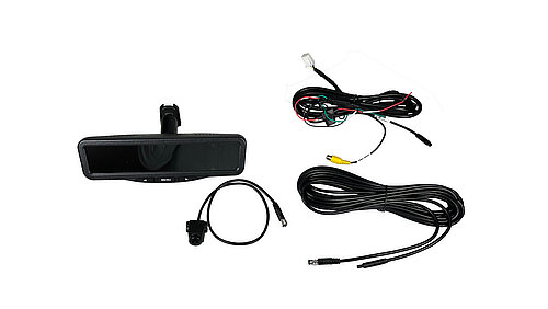inkl. 8m Kameraleitung, Haltebügel und Halterung zur Montage innen an der Heckscheibe - 1 × Video-Eingang (Cinch) / 1 x per Trigger ansteuerbar (z.B. für Rückfahrkamera)