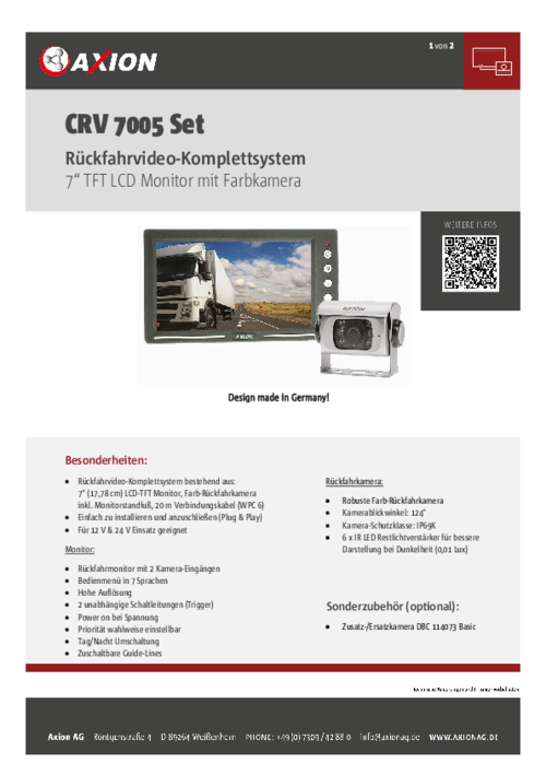 7“ (17,78 cm) LCD-TFT Rückfahr-Monitor, Farb-Rückfahrkamera inkl. Monitorstandfuß, 20 m Verbindungskabel.