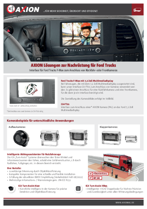 Interface zum Anschluss einer* AXION Kamera an Ford Trucks F-MAX Modelle mit 7,2 Zoll Touch Screen Multimediadisplay.