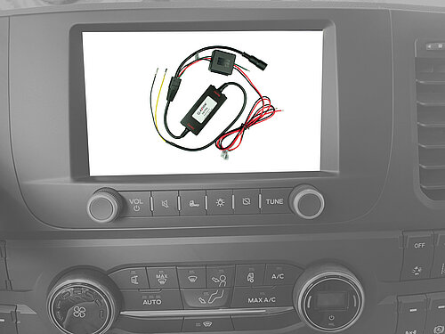 Bei Fahrzeugen, die mit dem 7,2 Zoll Multimediadisplay ausgestattet sind, kann das Interface CA-FT01 zum Anschluss von AXION Kameras verwendet werden. Es gibt einen Anschluss für eine Rückfahrkamera und eine Frontkamera, für die dann je ein Interface benötigt wird.