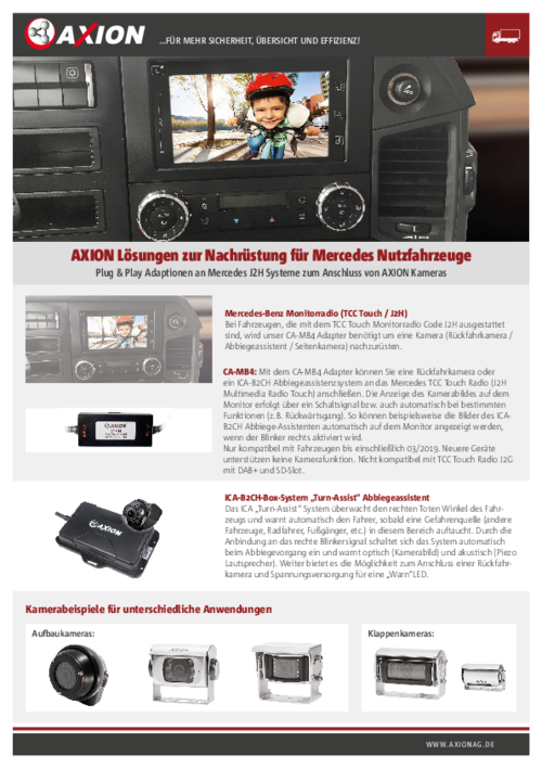 Mit dem CA-MB4 Adapter können Sie eine Rückfahrkamera oder ein ICA-B2CH Abbiegeassistenzsystem an das Mercedes TCC Touch Radio (J2H Multimedia Radio Touch) anschließen.