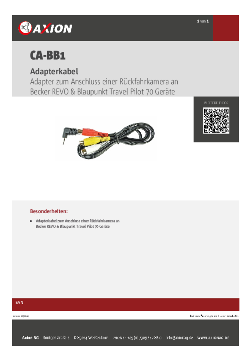 Adapterkabel zum Anschluss einer Kamera mit Cinch an Becker Revo /Transit & Blaupunkt Travel Pilot Geräte mit Kameraeingang.