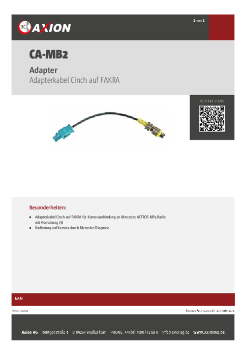 Adapterkabel Cinch auf FAKRA für Kameraanbindung an Mercedes ACTROS MP4 Radio mit Vorrüstung J9J.