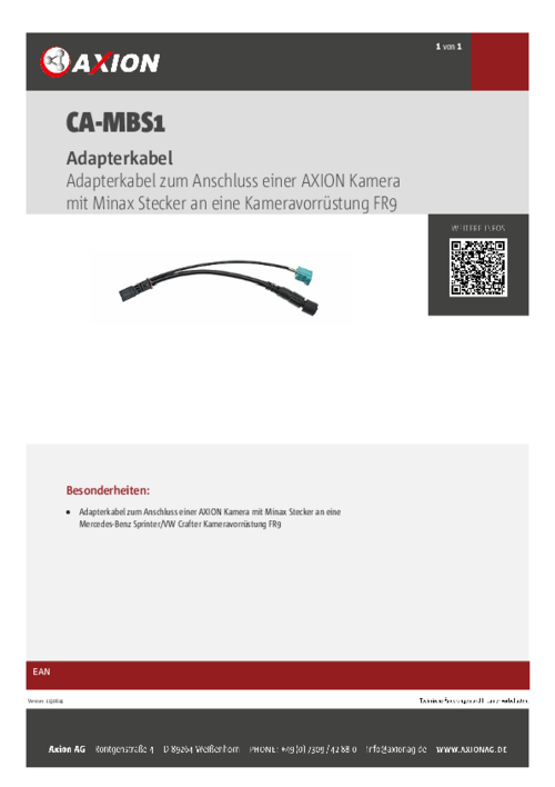 Adapterkabel zum Anschluss einer AXION Kamera mit Minax Stecker an eine Mercedes-Benz Sprinter/VW Crafter Kameravorrüstung FR9.
