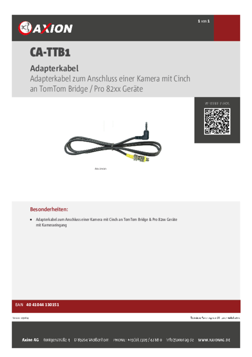 Adapterkabel zum Anschluss einer Kamera mit Cinch an TomTom Bridge & Pro 82xx Geräte mit Kameraeingang.