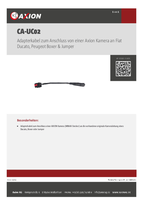 Adapter für den Anschluss einer AXION Kamera (MINAX-Stecker) an die vorhandene originale Kameraleitung eines Ducato, Boxer oder Jumper.