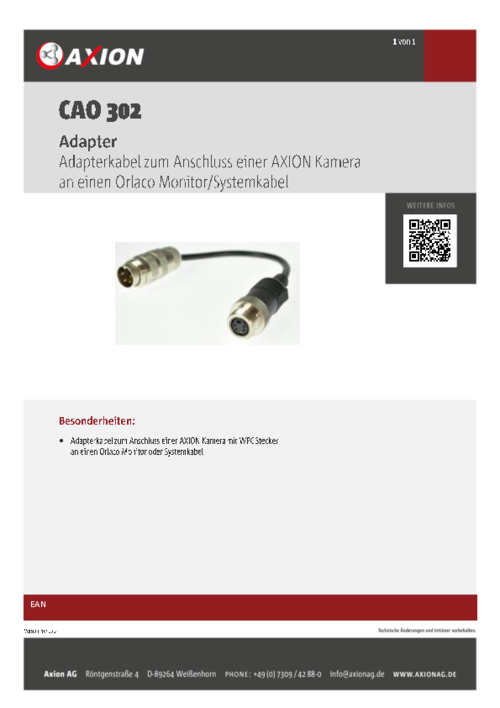 Adapterkabel für eine AXION Kamera -> Orlaco Monitor/Systemkabel