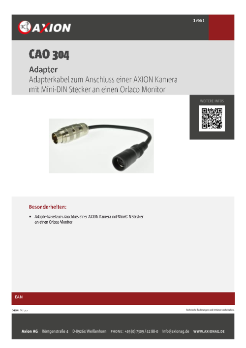 Adapterkabel zum Anschluss einer AXION Kamera mit Mini-DIN Stecker an einen Orlaco Monitor.