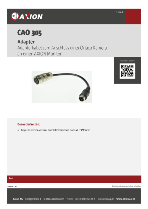 Adapterkabel zum Anschluss einer Orlaco Kamera an einen AXION Monitor.