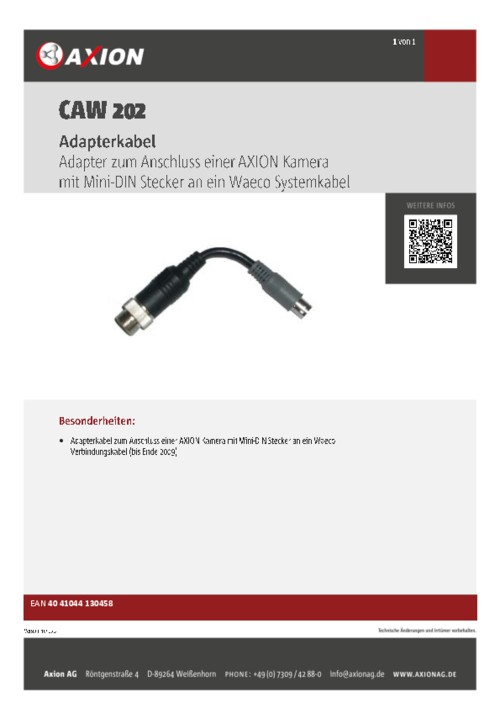 Adapterkabel zum Anschluss einer AXION Kamera mit Mini-DIN Stecker an ein Dometic (Waeco) Verbindungskabel (bis Ende 2009).