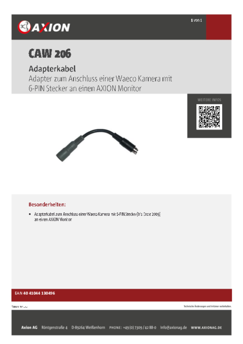 Adapterkabel zum Anschluss einer Dometic (Waeco) Kamera mit 6-PIN Stecker (bis Ende 2009) an einen AXION Monitor.