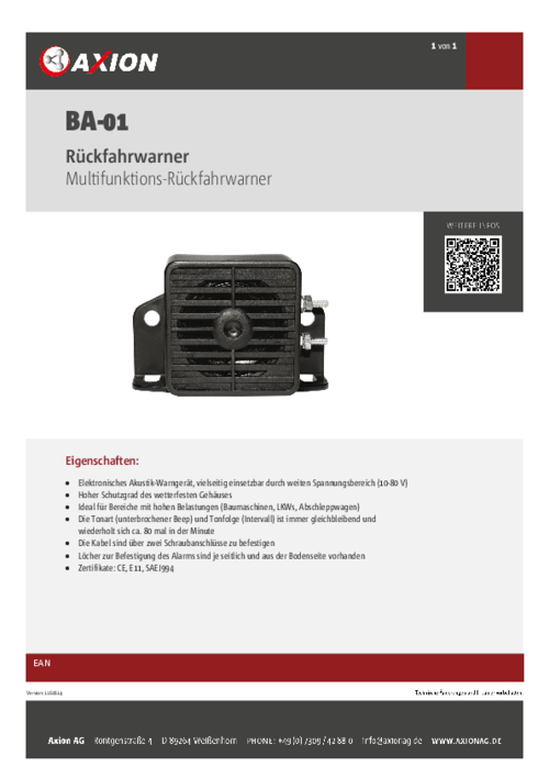 Die Kabel sind über 2 Schraubanschlüsse zu befestigen. Löcher zur Befestigung des Alarms sind je seitlich und auf der Bodenseite vorhanden. Zertifikate: CE. E11, SAEJ994.