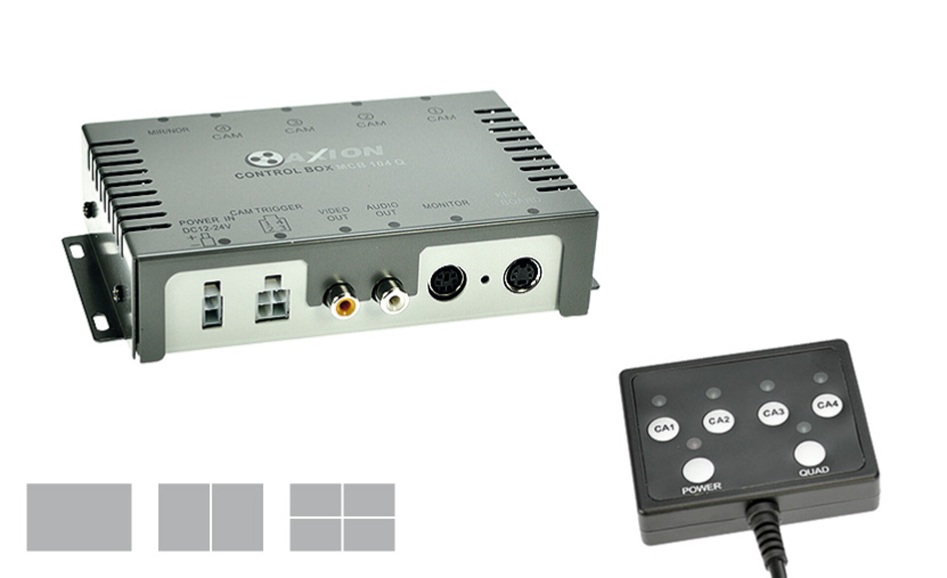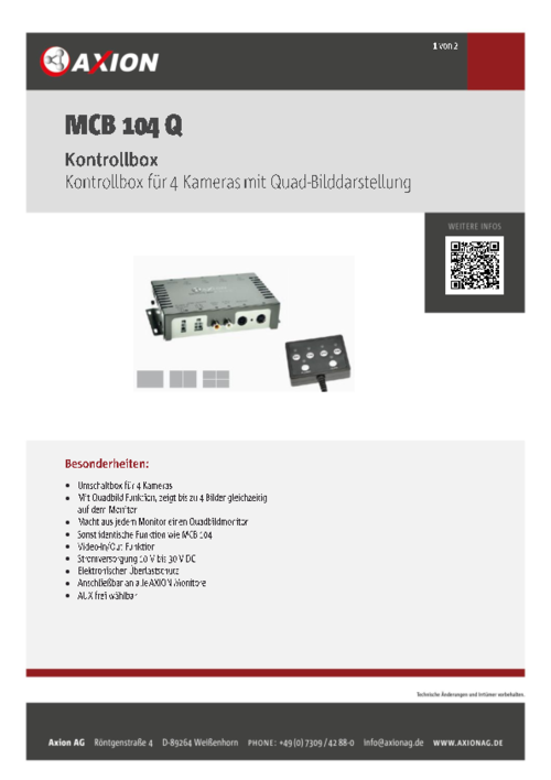 Umschaltbox für 4 Kameras Mit Quadbild Funktion, zeigt bis zu 4 Bilder gleichzeitig auf dem Monitor Macht aus jedem Monitor einen Quadbildmonitor Sonst identische Funktion wie MCB 104 Video-In/Out Funktion Stromversorgung 10 V bis 30 V DC Elektronischer Überlastschutz Anschließbar an alle AXION Monitore AUX frei wählbar -