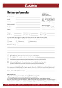 Bitte klicken Sie hier um unser Retourenformlar zur Anmeldung von Serviceeinsendungen herunterzuladen. Senden Sie das ausgefüllte Formular zur Freigabe an folgende Fax Nummer: +49 (0)7309-4288-29 oder an service(at)axionag.de